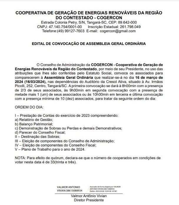 Dia 16 de março de 2024, acontece a Assembleia Geral Ordinária da COGERCON. Todos os associados e associadas estão convocado/as, a assembleia também estará aberta